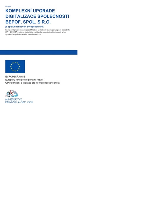 Komplexní projekt modernizace IT řešení společnosti zahrnující upgrade základního HW i SW, ERP systému včetně jeho rozšíření a propojení dalších agent, až po vytvoření a spuštění nového vlastního eshopu. Publicita _ Bepof.pdf